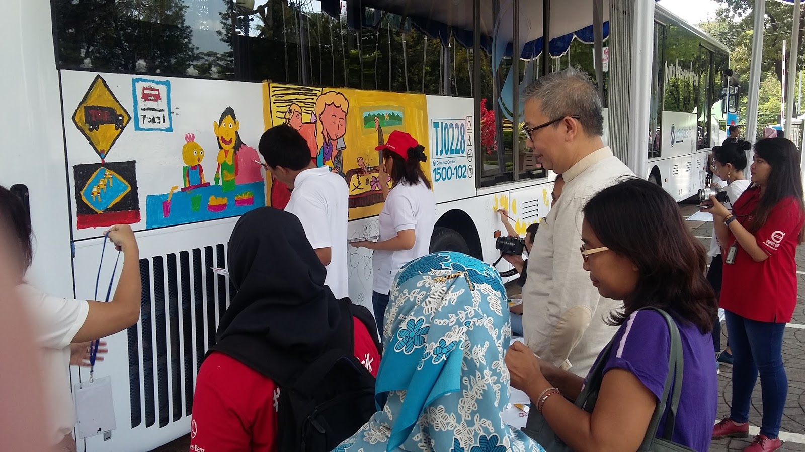 Hari selasa lalu (24/4/18) bus Trans Jakarta dengan motiv gambar karya anak-anak difabel diluncurkan oleh pemda DKI. Bus tersebut telah dihias aneka lukisan dengan menggunakan cat akrilik oleh para anak-anak autisi yang tergabung dalam yayasan Art Brut Indonesia asuhan pak Toto.