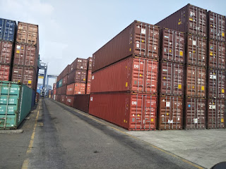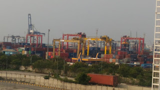 Lalu saya melihat alat-alat berat yang bergerak kesana-kemari mengangkut dan memindahkan petikemas dengan ukuran besar.